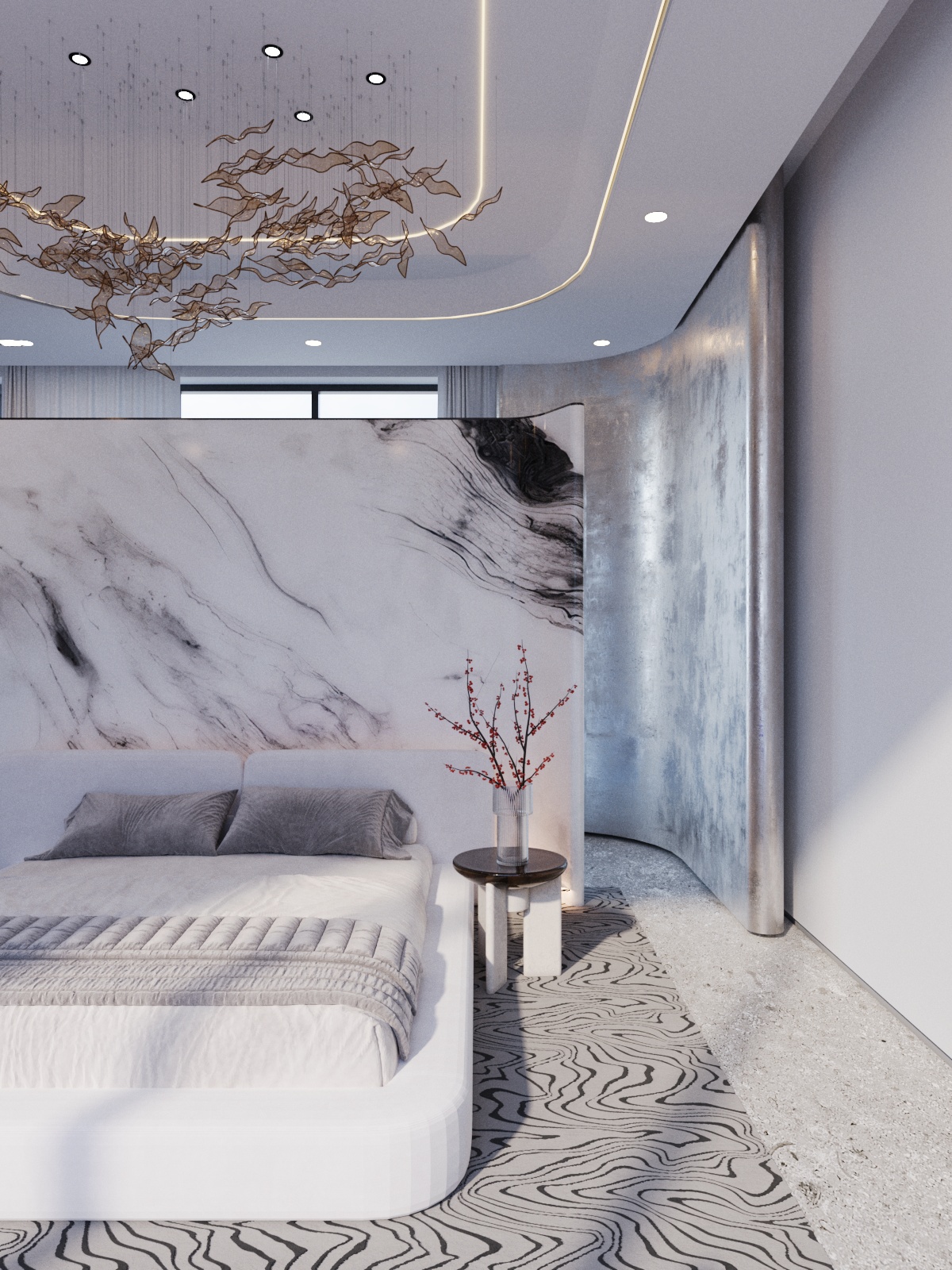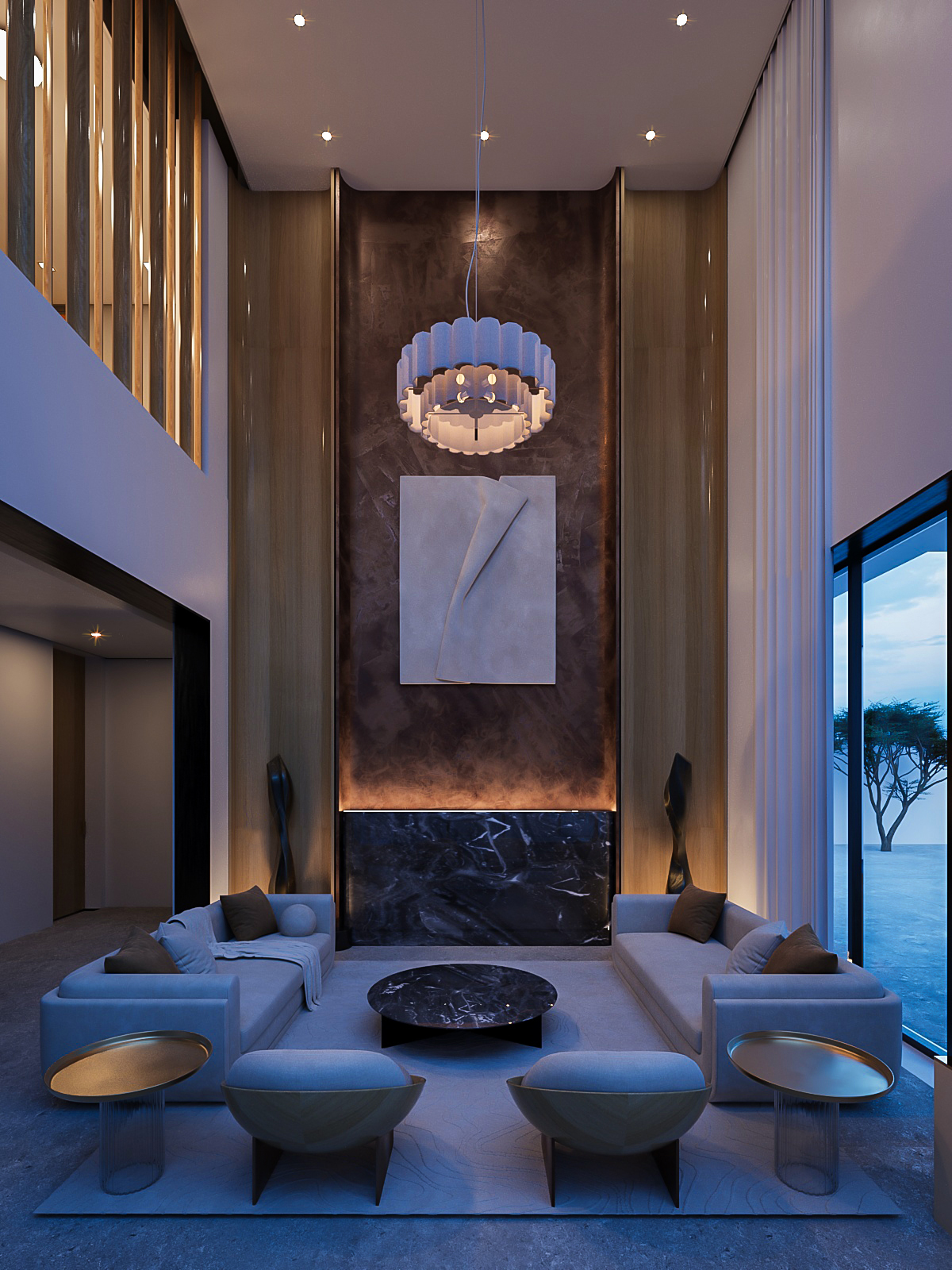 This interior is a masterpiece of contemporary sophistication, where simplicity meets refined luxury. The double-height design creates an airy openness, while a palette of rich textures—polished marble, natural wood, and soft fabrics—adds depth and warmth. A sculptural chandelier floats above, casting a serene ambiance that enhances the space’s elegance.
